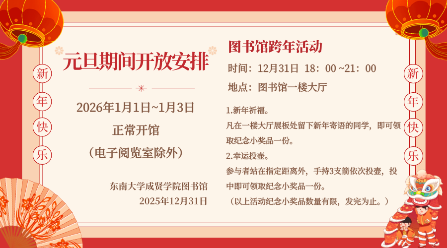 期末临近,元旦期间图书馆坚持开馆为读者服务,请同学们自觉遵守规章制度,配合管理,珍惜把握好图书馆空间和资源。图书馆将继续竭诚为您服务!