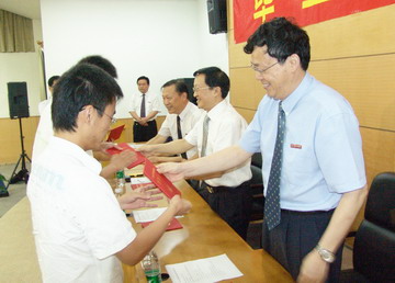 易红董事长(右中)等领导向获奖同学颁发荣誉证书 |