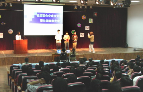 学院学生社团部部长朱鹏同学介绍了社团的成长历程,并对社团一年的工作情况进行了总结。获得优秀社团称号的“乐舞地带”舞蹈社社长张雯同学、“贤林”文学社社长杨雪同学和“天使之城”爱心会馆社长李丽娟同学分别通过播放反映其社团工作的DV资料片,汇报了社团的工作。文学社滕飞同学,经济社周文倩同学,计算机协会李超同学,获得了学生社团先进个人的荣誉。