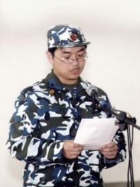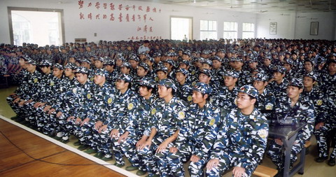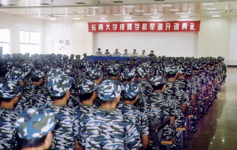 开训典礼会场 9月5日下午3点,成贤学院2004级新生军训开训典礼在空军98490部队会堂举行,全体新生一身迷彩,精神抖擞的参加了大会。