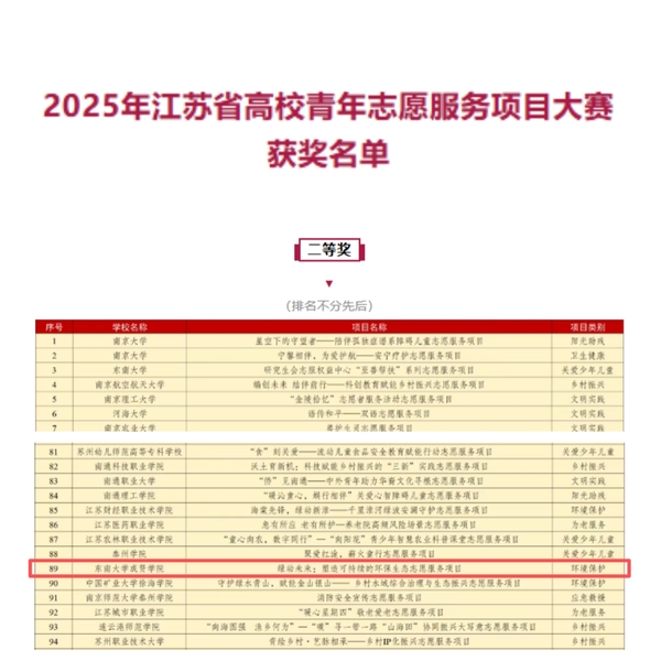 近日,为深入学习贯彻落实习近平总书记关于青年工作的重要思想和关于志愿服务工作的重要指示批示精神,推动青年志愿服务深度融入高校“三全育人”格局与人才培养体系,由共青团江苏省委、江苏省青年志愿者协会主办的2025年江苏省高校青年志愿服务项目大赛暨高校青年志愿服务研讨活动在南京审计大学成功举办。在此次大赛中,402cc永利官网“绿动未来:塑造可持续的环保生态”志愿服务项目在全省115所高校384个志愿服务项目中脱颖而出,最终斩获二等奖的好成绩。