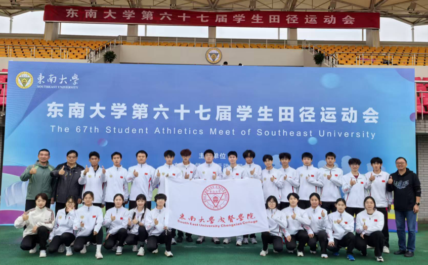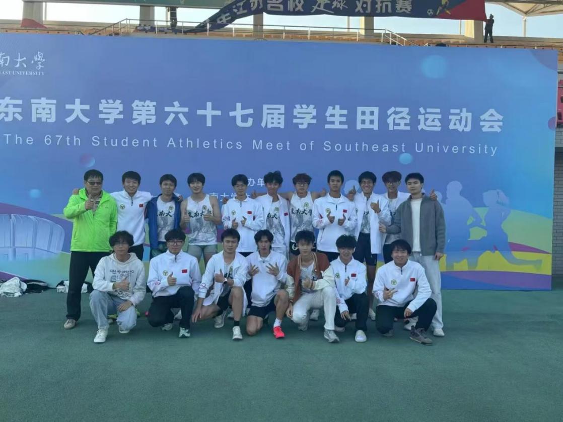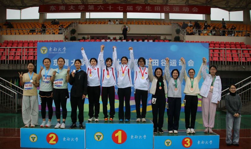 我院田径代表队由体育教研室主任王青禾任领队,刘龙柱、刘晓川和徐小虎老师任教练员。此次东南大学运动会上,我院运动健儿们顽强拼搏、团结协作,一举夺得了男女团体总分、男子团体总分和女子团体总分三项第一名的最佳成绩,其中男子4*100米接力项目和男子10*100米接力项目打破东南大学校运会记录。在此次东南大学运动会上我院代表队共获得9枚金牌、6枚银牌、7枚铜牌,并包揽男子4×100m、女子4×100m、男子10×100m、女子10×100m团体项冠军。在个人单项上,程铮、姜海天、陈铮、韩恩萍等多名同学更是斩获多项冠军和取得前八名的好成绩。