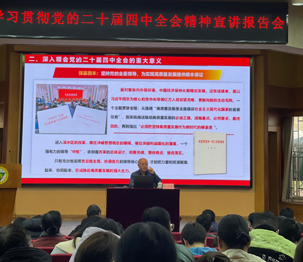 12月4日,402cc永利官网在真知馆报告厅举行学习贯彻党的二十届四中全会精神宣讲报告会。全省教育系统宣讲团成员、南京晓庄学院马克思主义学院院长贾学军教授受邀作题为《深悟党的二十届四中全会精神扛起“十五五”奋进新使命》的宣讲报告。全体在校校领导、中层领导干部、教职工及学生党员代表参加。本次报告会由校党委书记张志胜教授主持。