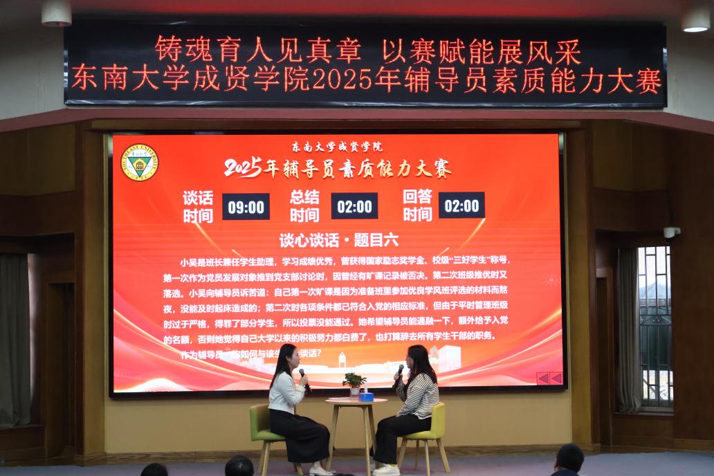 大赛分为基础理论知识测试、案例研讨与谈心谈话三个环节。12月1日,全校43名专职辅导员参加了理论知识测试,内容涵盖党的创新理论、思想政治工作相关政策法规及辅导员专业知识等。12月19日,案例研讨与谈心谈话环节比赛在真知馆报告厅举行,共有8位辅导员进入该环节角逐。东南大学党委学生工作部副部长、党委武装部副部长丁小丽、南京农业大学公共管理学院党委副书记宋俊峰及校内相关职能部门负责人分别担任评委,学校党委副书记、副院长、纪委书记尹威出席活动,各学院党政领导、全体辅导员及学生代表到场观摩。
