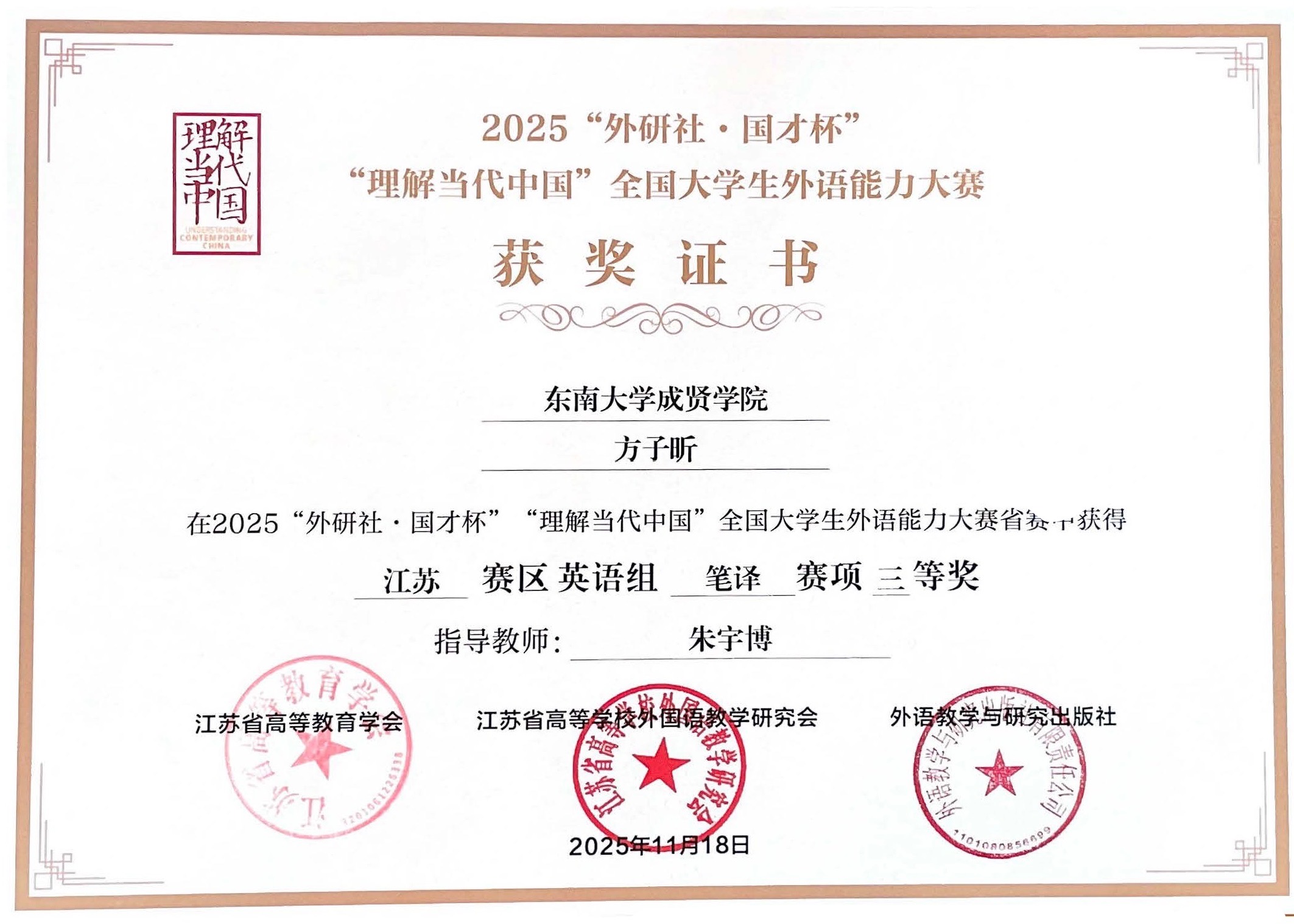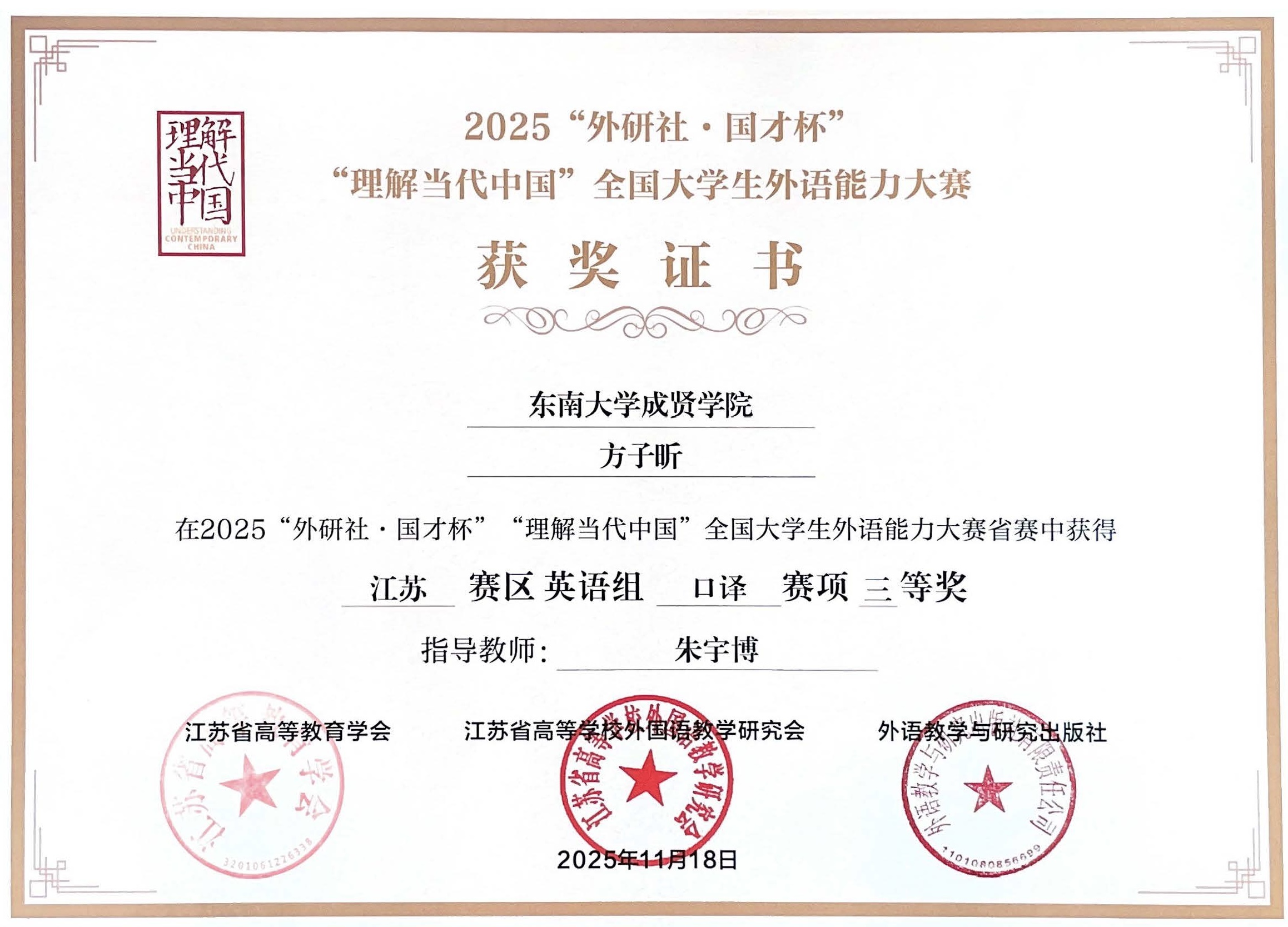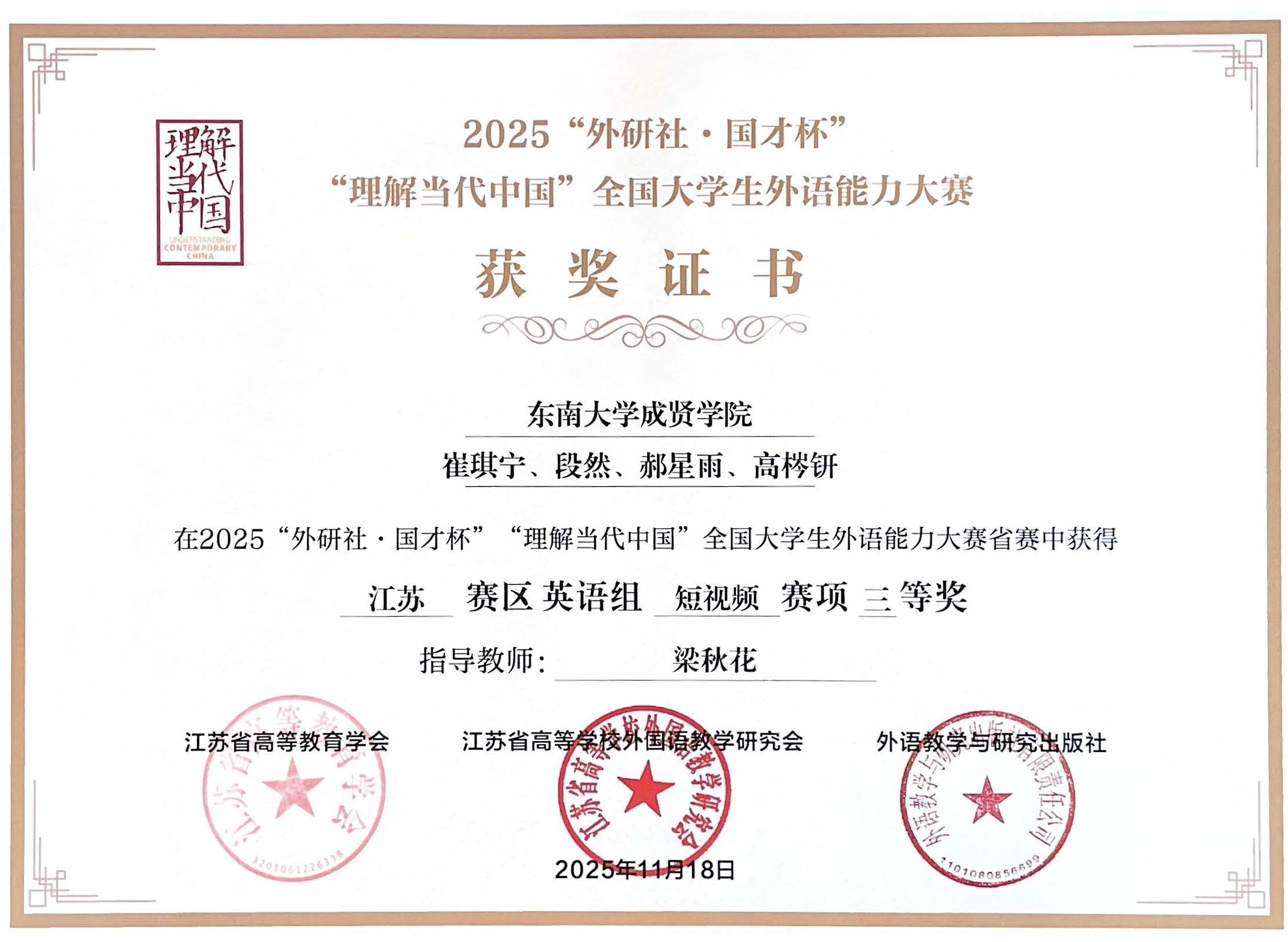 10月—11月,2025“外研社•国才杯”“理解当代中国”江苏大学生外语能力大赛暨全国大赛江苏赛区选拔赛的各项赛事陆续落下帷幕,402cc永利官网在笔译大赛、口译大赛、短视频大赛等比赛中共获得三等奖3项,这也是402cc永利官网首次在笔译大赛和口译大赛中获得奖项。