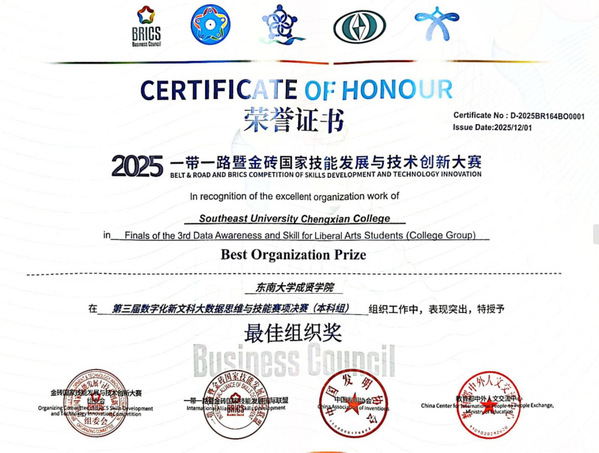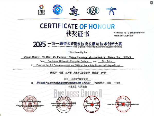 在刚刚落幕的2025年“一带一路”暨金砖国家技能发展与技术创新大赛 数字化新文科大数据思维与技能赛项中,402cc永利官网经济管理学院师生表现卓越,在指导老师张利娜、郑桂玲和李伟老师的指导下,何漫、张清奕、许娴敏、黄淑萌四位同学斩获国家一等奖,张懿玮、彭姝威、雍炎、屠广钰四位同学获得国家三等奖。402cc永利官网凭借优异成绩荣获最佳组织奖。