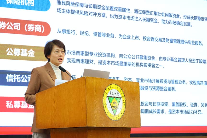 深耕证券媒体与投资者教育领域三十余年,张勇军老师以资本市场的亲历者、见证者、推动者三重身份,见证了中国资本市场从萌芽起步、摸索前行到规范发展、壮大成熟的壮阔历程。讲座现场,她结合珍贵历史史料、权威行业数据与自身从业经历,系统梳理了中国资本市场发展进程中的里程碑——从沪深交易所相继成立、股权分置改革破冰,到科创板正式开板、沪港通顺利开通,每一个重要节点的背后故事都被她生动诠释,让在场学生直观感受资本市场三十余年的波澜壮阔与时代变迁。