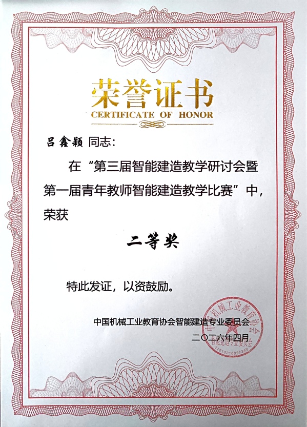 近日,由教育部高等学校土木类专业教学指导委员会指导、中国机械工业教育协会智能建造专业委员会等单位主办的第三届智能建造教学研讨会暨全国第一届青年教师智能建造教学比赛在苏州圆满落幕。402cc永利官网土木与交通工程学院吕鑫颖老师凭借扎实的专业功底、创新的教学设计与出色的课堂表现,在全国众多参赛选手中脱颖而出,荣获二等奖,充分展现了我校青年教师过硬的教学能力与良好的专业素养。